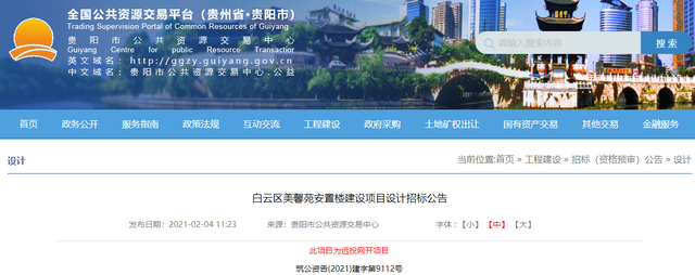2月4日,贵阳市公共资源交易中心发布了关于白云区美馨苑安置楼建设项设计招标公告。