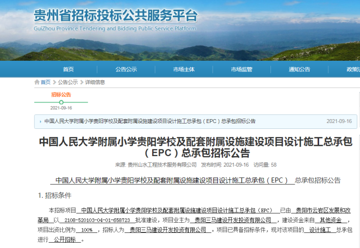 9月16日,据贵州省招标投标公共服务平台公示,中国人民大学附属小学贵阳学校及配套附属设施建设项目发布了设计施工总承包(EPC)招标公告。