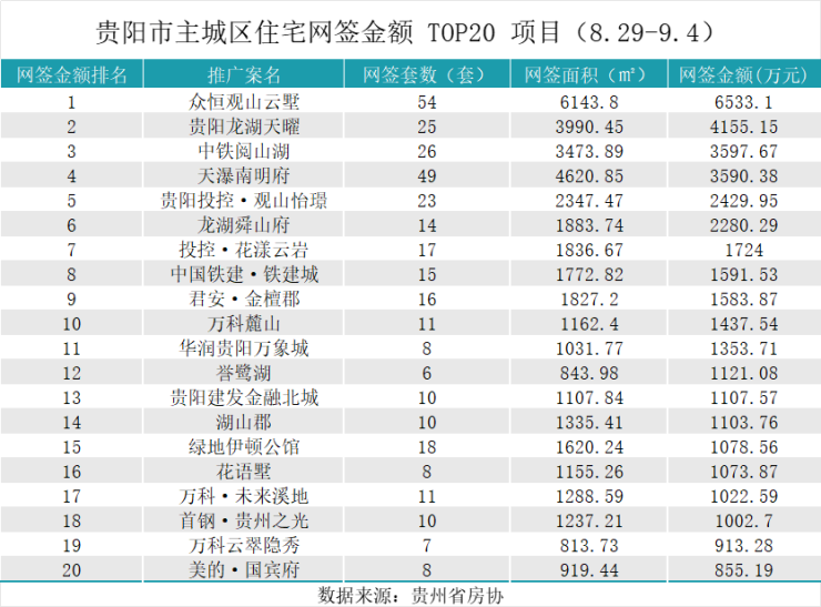 据贵州省房协统计数据,2025年8月29日至2025年9月4日,贵阳主城六区住宅网签金额榜单中: