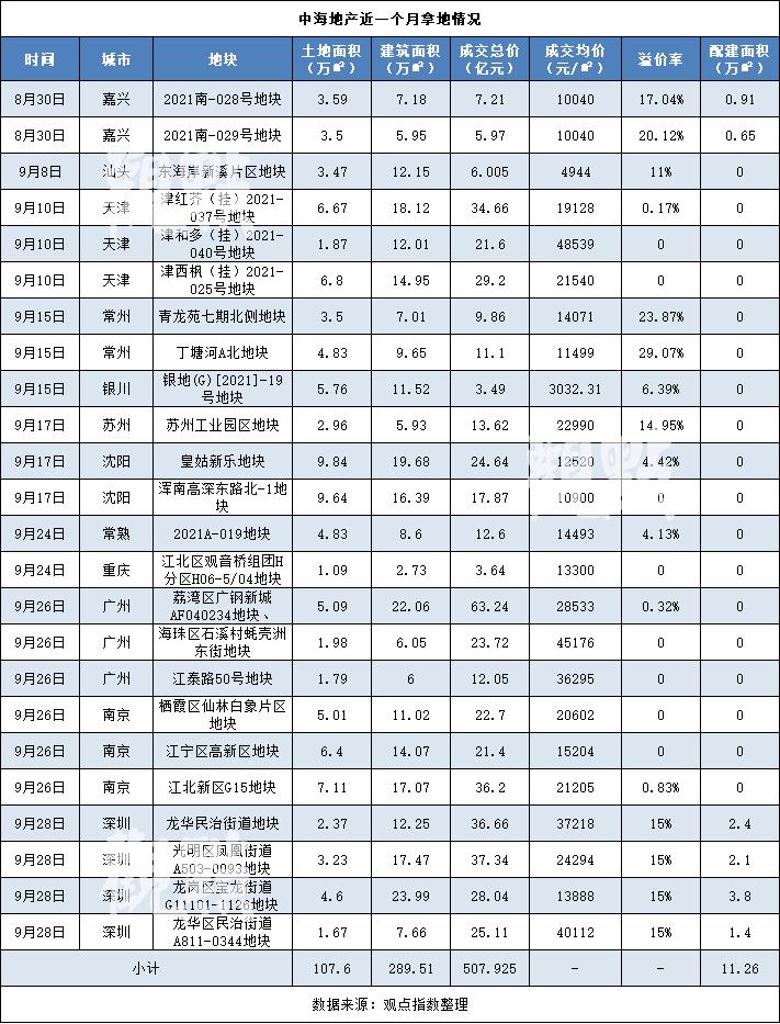 据观点地产新媒体不完全统计,自8月30日至今,中海地产已累计在天津、苏州、沈阳、重庆、广州、南京、深圳等12个城市共计新增24宗地,对应建筑面积289.51万平方米,成交总价507.91万平方米。