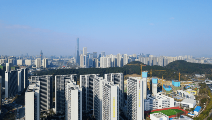 它正南北地矗立在映山湖公园与长坡岭国家级森林公园中间,树起一道「前瞰湖泊、后拥森林 」的风景线。