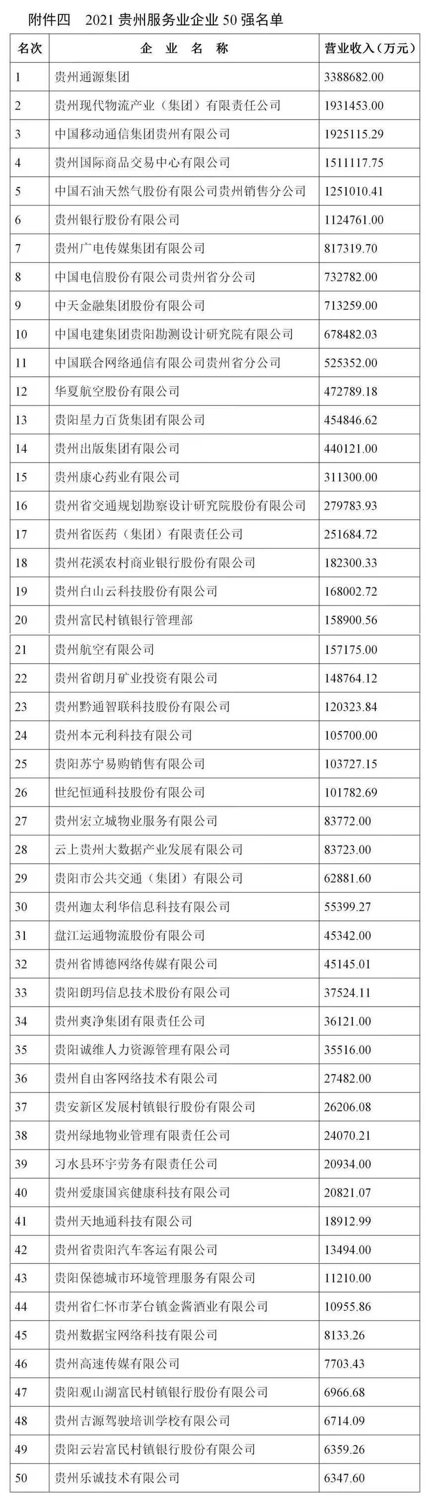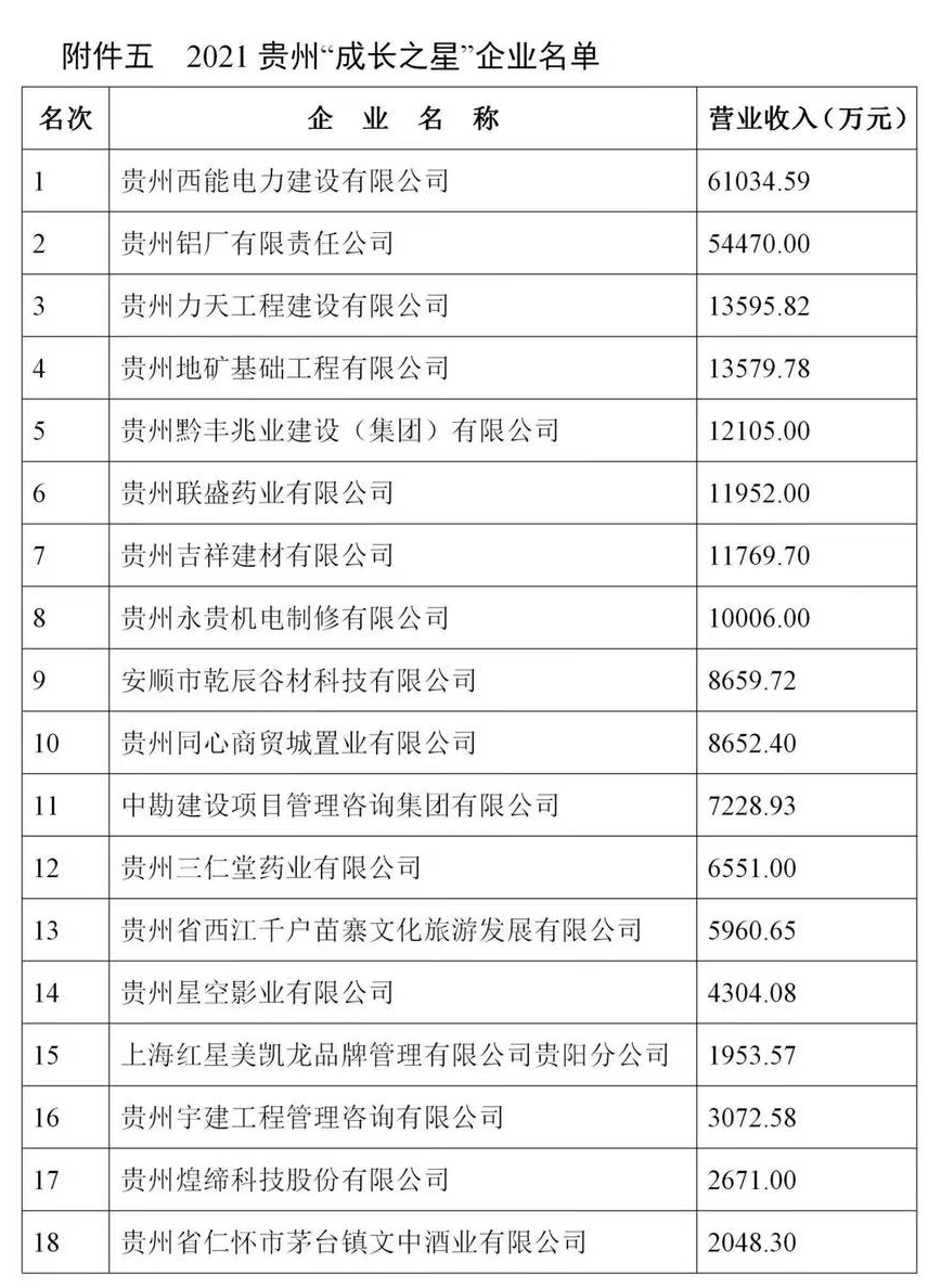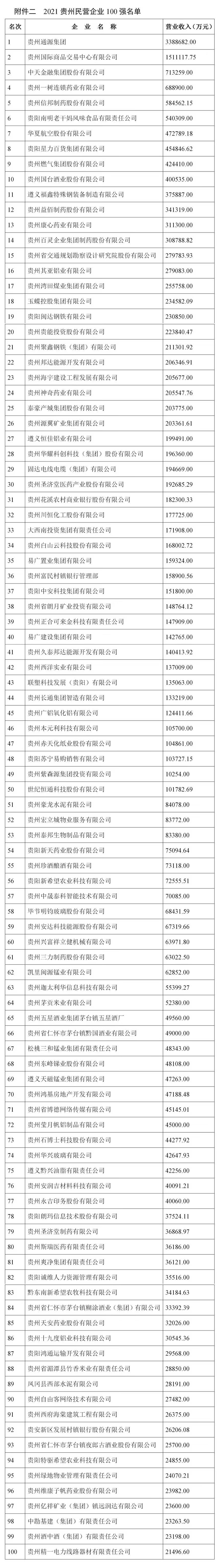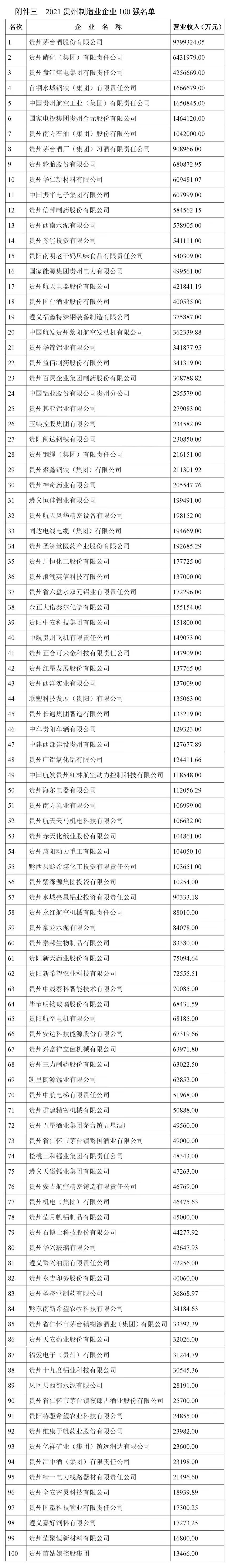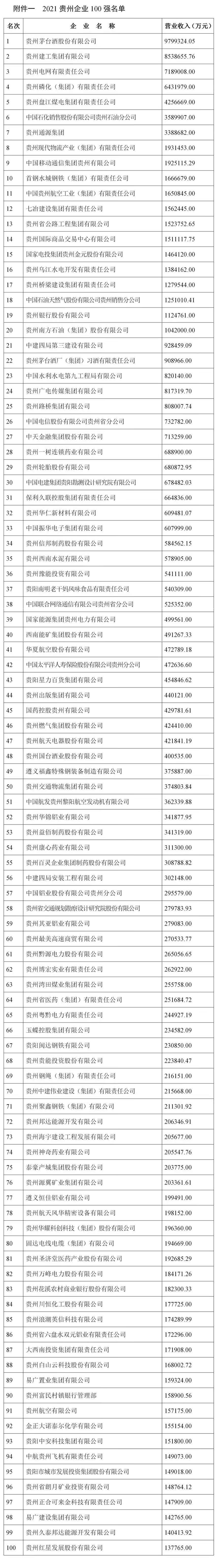 11月1日,贵州省企业联合会、贵州省企业家协会在贵阳发布《2021贵州百强企业榜单》及《2021贵州百强企业发展报告》。贵州茅台酒股份有限公司、贵州建工集团有限公司、贵州电网公司位居贵州企业100强前三位。