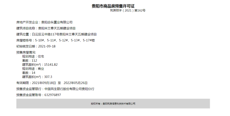 据贵阳市商品房预售许可证筑房预字(2021)第162号文件,贵阳米兰春天五期建设项目取得预售证。该项目位于白云区云中路117号;本次获预售楼栋为5-10#、5-11#、5-12#、5-13#、5-17#楼;