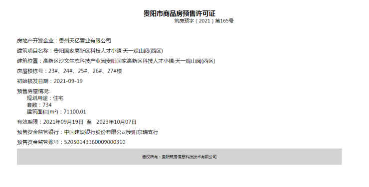住宅房源734套,准许销售面积71100.01㎡;开发企业为贵州天亿置业有限公司。