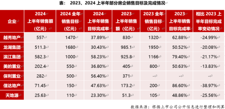 根据中指研究院统计,今年上半年,销售完成度较高的滨江集团上半年销售额582.3亿元,相比于1000亿元的销售目标,已经完成58.23%。此外,越秀地产、龙湖集团的销售目标完成率分别为37%和30%。