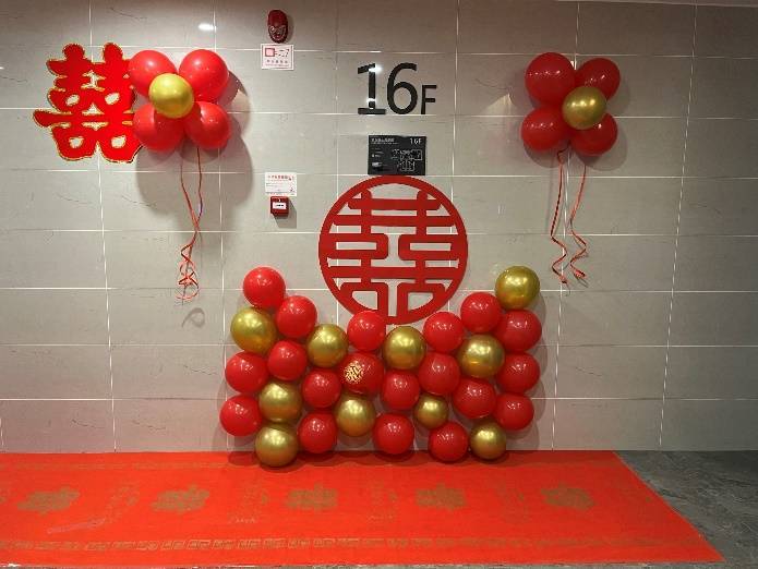 贵阳万科麓山小区有一对新人即将举行婚礼,万科物业管家“西芎”亲自上门为业主做婚庆服务,红色的装饰让业主家中更加喜庆热烈,梦幻多彩的气球浪漫满溢,装载着管家对新人的热情祝福,自此与这对夫妻成为无话不谈的朋友;