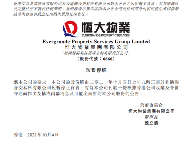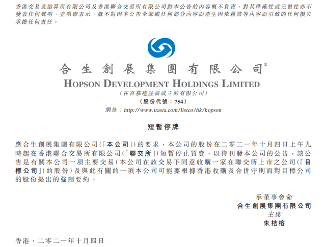 此前10月4日,恒大物业、中国恒大和合生创展集体停盘。合生创展在公告中宣布将收购一家在联交所上市的公司股份;恒大物业则在停牌公告里宣布,待本公司刊发一份根据香港公司收购及合并守则而作出及构成内幕消息及可能全面要约本公司股份的公告。有消息称,合生创展拟用超200亿港元收购恒大物业51%的股份,后者市场估值超400亿港元。