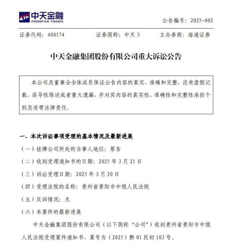 3月21日,中天金融发布重大诉讼公告称,公司作为原告向华夏人寿股权交易方两家公司(北京千禧世豪电子科技有限公司、北京中胜世纪科技有限公司),以及两家公司控制方明天控股有限公司提起诉讼,要求返还70亿元定金及资金占用损失。