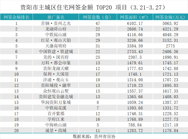 据贵州省房协统计数据,2025年3月21日至2025年3月27日,贵阳主城六区住宅网签金额榜单中: