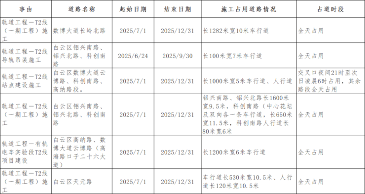 据悉,T2线一期近期占道施工路段包括观山湖区数博大道长岭北路,以及白云区数博大道云博路、科创南路、铝兴南路、天元路等。