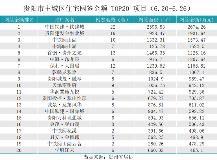 据贵州省房协统计数据,2025年6月20日至2025年6月26日,贵阳主城六区住宅网签金额榜单中: