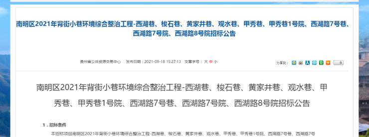 9月18日,据贵州省公共资源交易中心公示,贵阳市南明区多条背街小巷环境综合整治工程发布了施工招标公告。