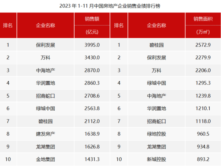 根据中指研究院和克而瑞研究中心两家机构的统计数据显示,今年前11个月,保利发展、万科、中海地产的(全口径)销售额分别为3995亿元、 3430亿元和2870亿元。 目前,保利发展、万科都站上了3000亿元的高点,尤其是保利发展,遥遥领先已经接近4000亿元,这两家房企的排名已定,几无悬念。