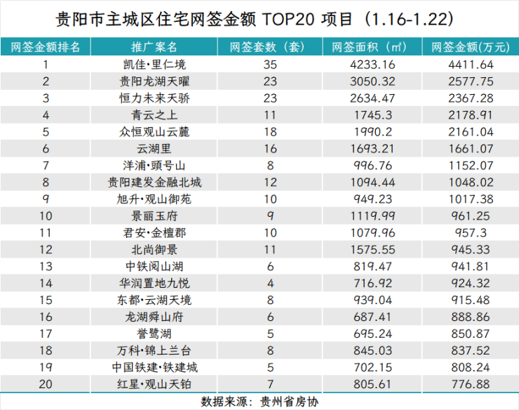 据贵州省房协统计数据,2026年1月16日至2026年1月22日,贵阳主城六区住宅网签金额榜单中: