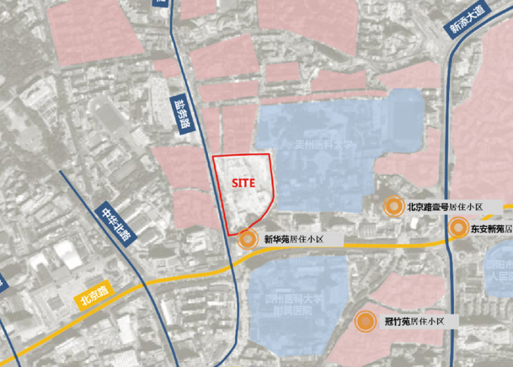 据悉,该项目地块位于云岩区盐务街,东至贵州医科大学,南至北京路,西至盐务街,北至农商行及居民小区。项目总用地面积3.4公顷,其中建设用地面积2.8公顷。