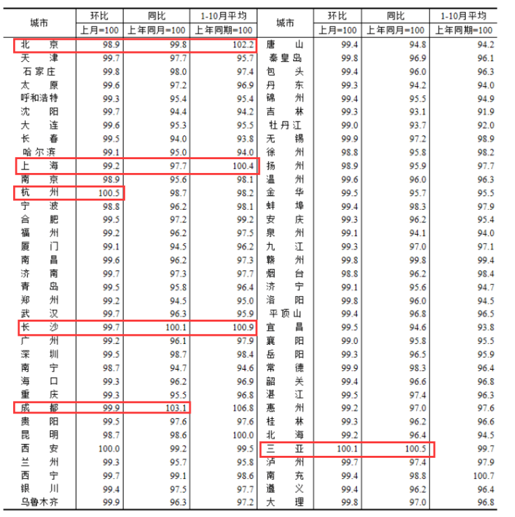 来自国家统计局数据也显示,10月二手房环比上涨的城市仅有两个,其中杭州以0.5%领涨全国,三亚环比微涨0.1%。