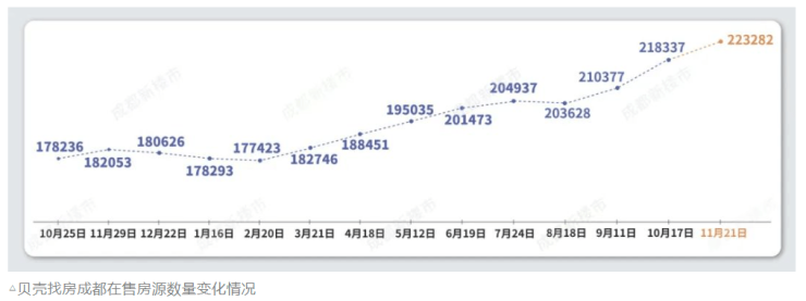 贝壳统计显示,2023年1月1日-22日二手房成交199294套,同比去年135383套,增长了63911套,同比增长47.2%。与此同时,二手房牌量也迅速增加,截至11月21日,成都二手房挂牌量为223282套,较今年1月份的挂牌量多了近45000套。