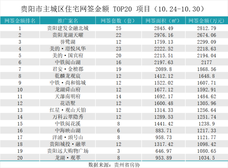 据贵州省房协统计数据,2025年10月24日至2025年10月30日,贵阳主城六区住宅网签金额榜单中:
