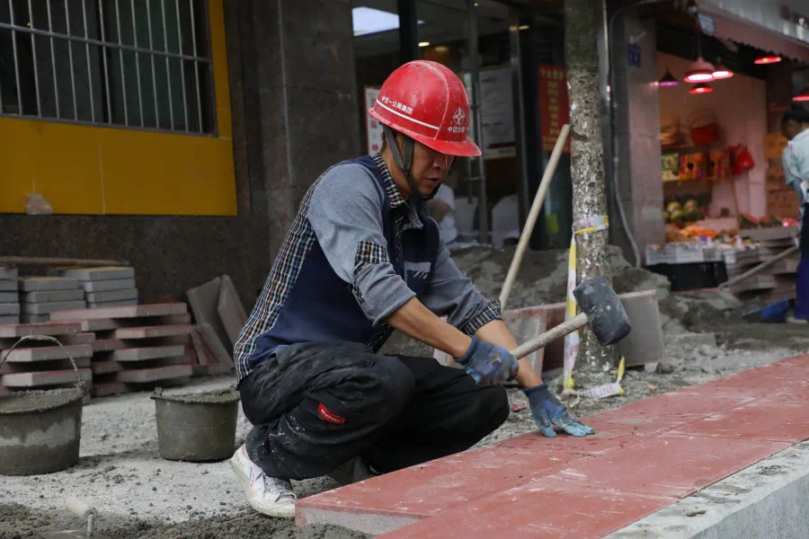工作人员铺设地砖