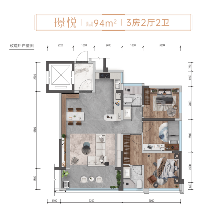 其中,94平户型,以H形竖厅布局呈现,三房两卫设计,动静分离,经典实用,还做到了电梯入户。值得一提的是,该户型还拥有一个5.3米的超宽客厅开间,带来了更为充足的采光和生活舒适性。