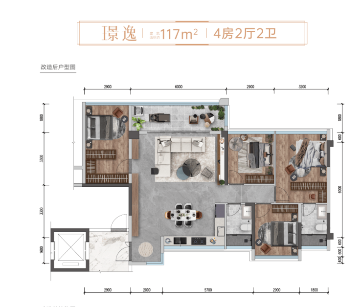 而117平户型更为优秀。同样采用电梯入户的设计,但该户型有更明确的玄关区域,可以做玄关收纳。同时,在3+1房两卫的布局下,既保证了生活空间的宽敞与舒适,又保留了户型的灵活性与可变性。客厅区域的面积也有所提升,再加上阳台的延伸,使得公共活动空间更加开阔明亮,整体居住体验相当优秀。