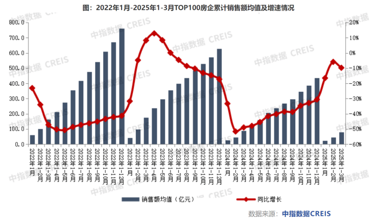 中指研究院近日发布的《2025年1—3月中国房地产企业销售业绩排行榜》显示,今年一季度,TOP100房企销售总额为8101亿元,同比下降9.8%;3月单月的销售额同比下降10.6%,单月销售业绩规模仍处于历史低位。