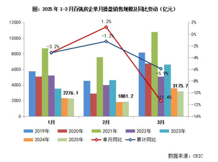 不过据克而瑞数据,3月百强房企实现操盘销售金额3175.7亿元,环比增长68.8%,同比下降11.4%。累计来看,百强房企今年一季度实现操盘销售金额7333亿元,同比降低5.9%。“2025年一季度,房地产市场整体保持低位运行,延续止跌回稳态势。”