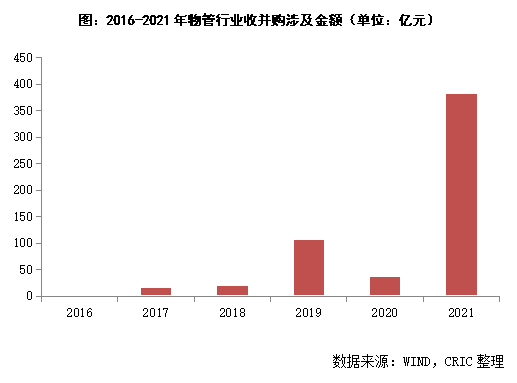 据中指研究院数据显示,截至2021年12月10日,今年物业管理行业已披露相关信息的并购交易达71宗,涉及并购方33家。交易金额约333.3亿元,相比2020全年交易总额大幅增长约215.33%。克而瑞研究中心的数据也表明,物管行业2021年收并购事件涉及金额远远超过过去几年,截至12月28日,总额高达382亿元。