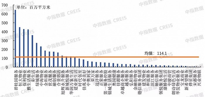 以上市公司数据为例,截至2021年6月30日,明确披露在管面积数据的港股上市公司共44家,规模较大的碧桂园服务,在管面积已达6.44亿平方米,而规模最小的兴业物联在管面积约360万平方米,前者是后者的约179倍。44家港股上市企业的在管面积均值为1.14亿平方米,处于均值以上的企业共有14家,均值以下的企业共有30家,头部企业的优势明显。