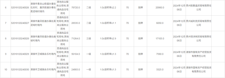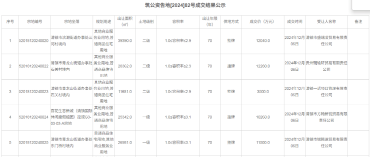 52018120240024号地块竟得单位为清镇市方翰新锐贸易有限责任公司(清镇市建设投资集团旗下子公司),成交价为10260万元。