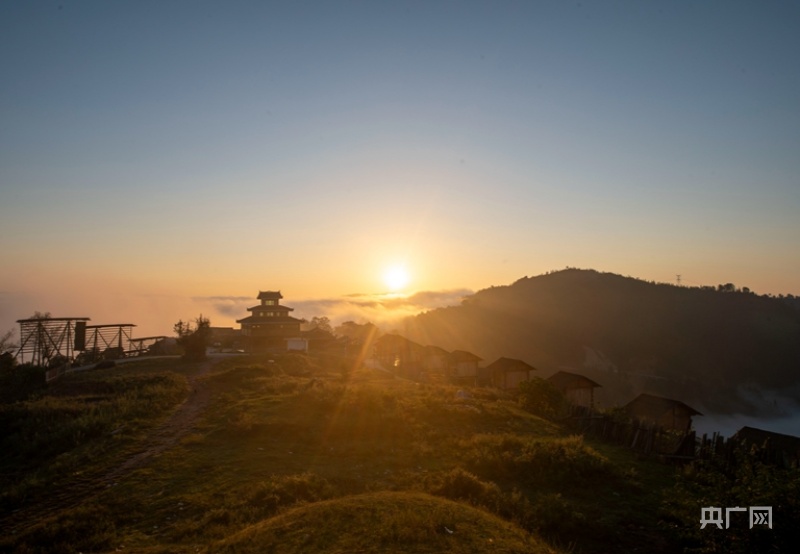 央广网贵州9月27日消息(记者周娴 通讯员吴德军)金秋时节,贵州省黔东南苗族侗族自治州从江县丙妹镇大歹苗寨景区云雾弥漫,鼓楼、民宿、吊脚楼和群山若隐若现,在朝阳照射下,美轮美奂。