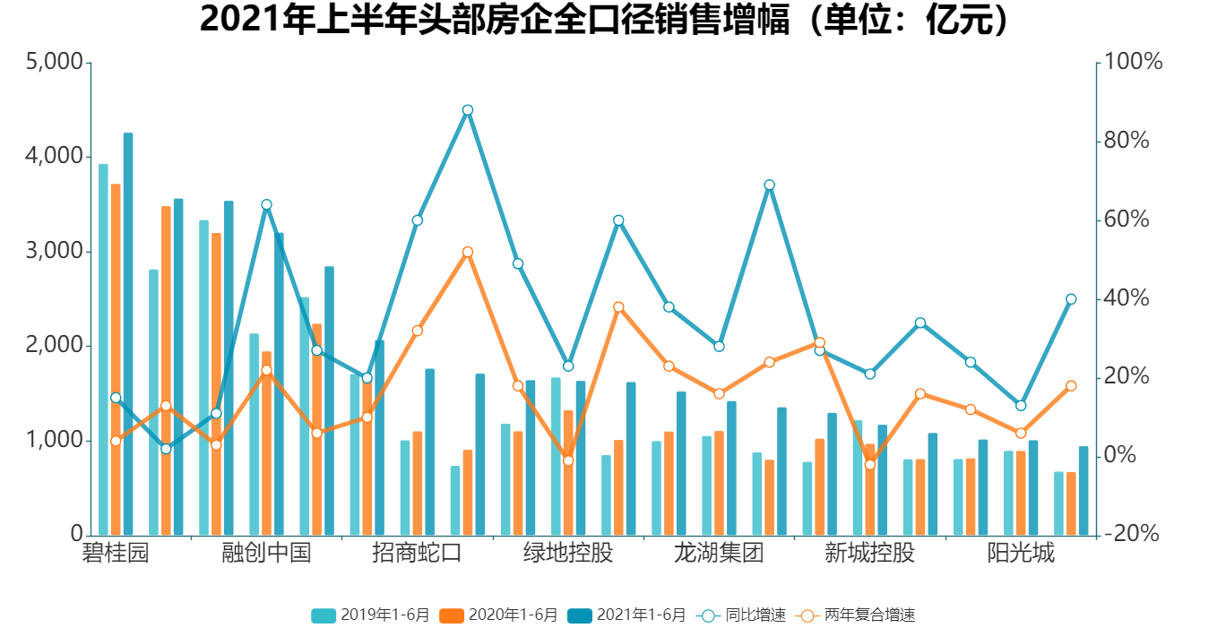 观点指数发布的“2021年1-6月房地产企业销售金额表现”研究显示,前100房企实现全口径总销售金额71221.8亿元,同比增长37.4%,较2019年同期增长33.8%,两年复合增长率为15.7%。