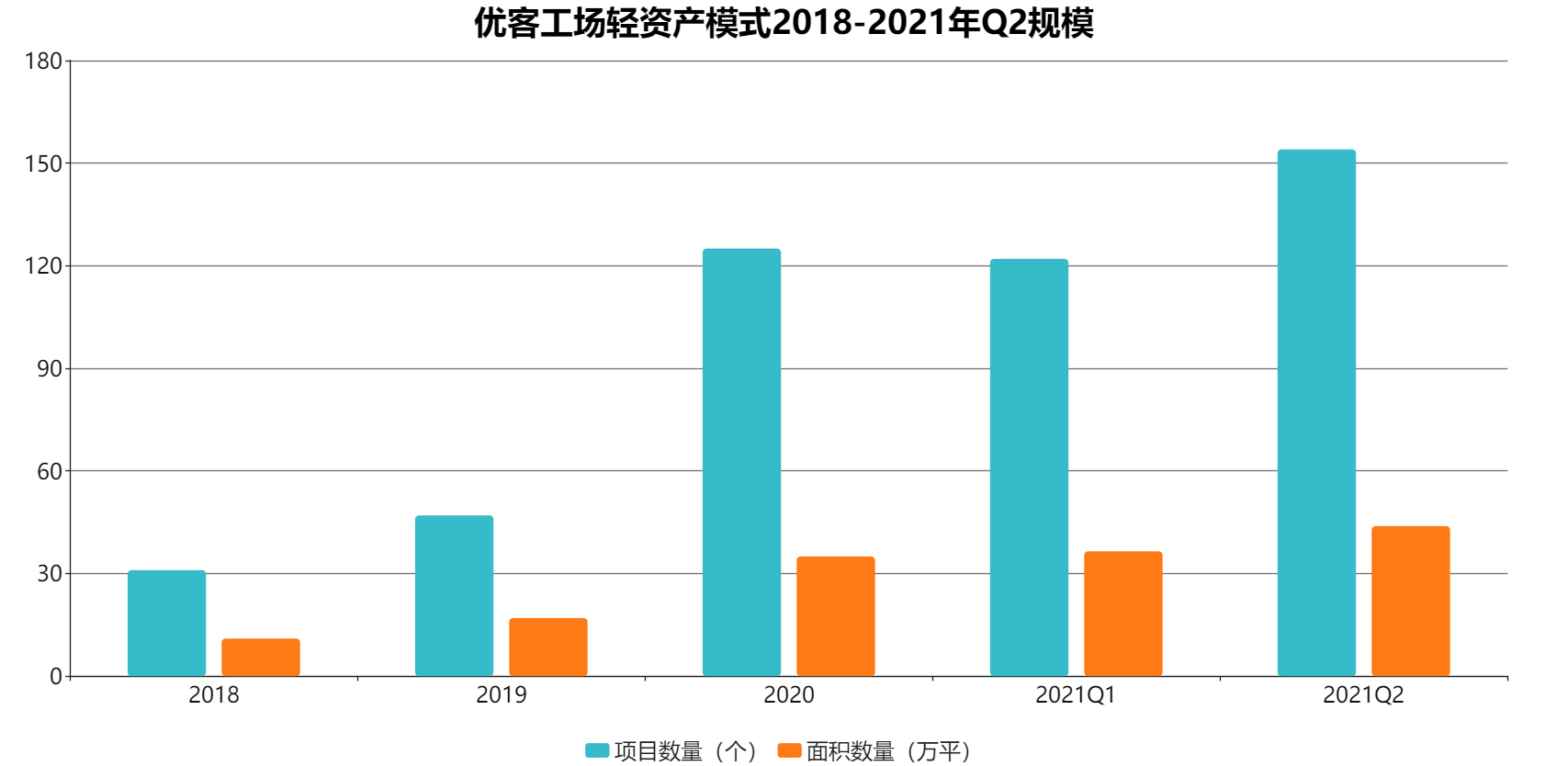 在上半年企业新签约项目中,轻资产模式占比高达79.17%,主要是由于优客工场转型轻资产模式。从2020年6月30日到2021年6月30日,优客工场轻资产模式下签约的空间总数增加了141%,签约项目数量位于联办行业首位。
