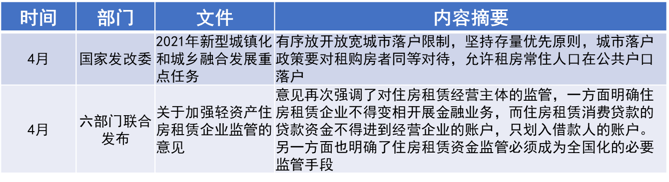 中央层面上,今年4月国家发改委发布《2021年新型城镇化和城乡融合发展重点任务》以及六部门联合发布《关于加强轻资产住房租赁企业监管的意见》。