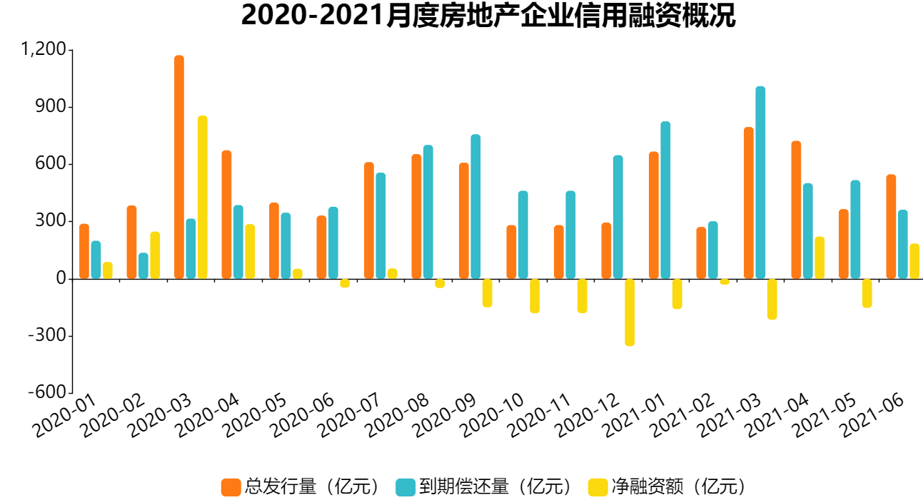 2021年上半年,房企信用债净融资总额为-146.96亿元,相较2020年同期减少了1633.96亿元。房地产债权融资缩减的主要原因在于上半年到期偿还量的激增,行业面临偿债高峰期。