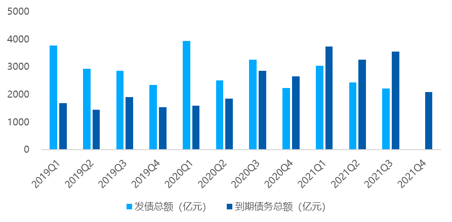 2019年至今房企季度债券融资发行与到期规模走势(季度值)