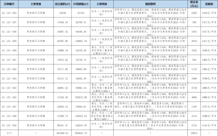 其中,贵安新区马场镇有GA〔23〕034、GA〔23〕037-042、GA〔23〕043-045、GA〔23〕047、GA〔23〕048、GA〔23〕052号共13宗住宅类土地挂牌入市。