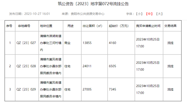 至于清镇市直接流挂的3宗住宅类土地(QZ〔23〕027-029号),则看起来短期内再次挂牌的可能性就相对更小一些了。