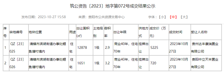 而在上述5宗地之外,近日,清镇市确有QZ〔23〕025、026号两宗住宅类土地成功出让。