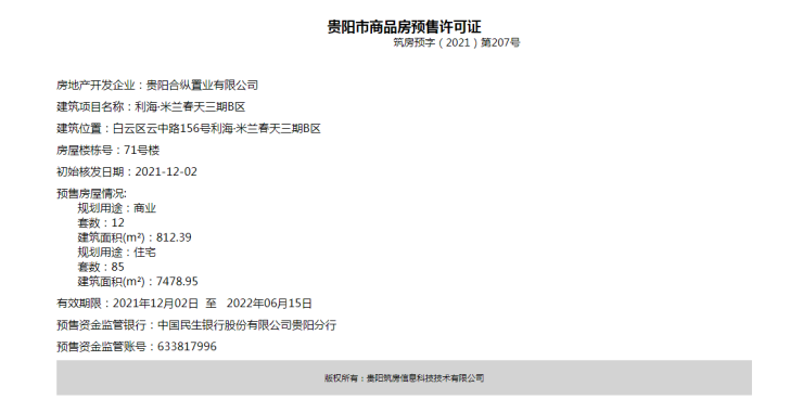12月21日,从筑房网获悉,利海·米兰春天三期B区新获预售,售房企业为贵阳合纵置业有限公司,预售证号为筑房预字(2021)第207号。