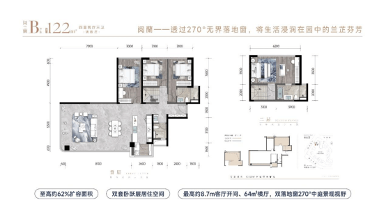 建面约122㎡实得约196㎡,跃层设计配合四房三卫双套房,约64㎡横厅衔接270°转角落地窗,空间体验可比肩高端改善住宅。