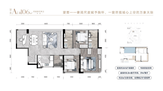 最后,产品本身足够“能打”。2T3设计,负公摊理念实现最高约62%的扩容面积,最大客厅面宽约8.8米,部分户型更配有270°转角落地窗,精准回应改善人群对空间的品质需求: