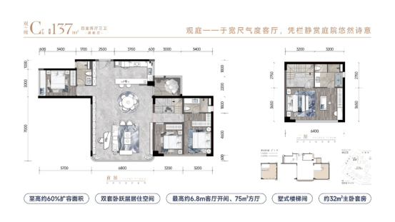 建面约137㎡实得约213㎡,4+1房三卫设计,拥有约6.8米大开间与约75㎡大方厅,无论是功能配置还是空间尺度,皆展现出超越同级的表现,堪称高端改善市场中难得的亮眼之作。
