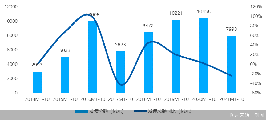 自融资“三道红线”出台后,房企发债规模以肉眼可见的速度在下降。11月1日,贝壳研究院发布数据显示,2021年1-10月房企境内外债券融资累计约7993亿元,较2020年同期下降24%,金额规模减少2463亿元。前10月累计降幅较今年前三季度进步一增大,2021年1-10月发债规模占比2020年全年约66%。