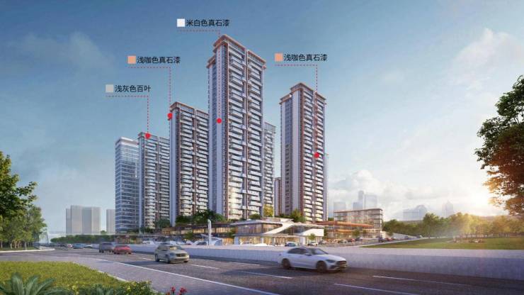 贵阳城投南溪住宅外立面,采用高端真石漆工艺,呈现堪比天然石材的肌理与厚重感。真石漆具备优异的抗裂性、耐候性与自洁功能,能从容应对风雨侵蚀,恒久守护家的温馨与安宁。