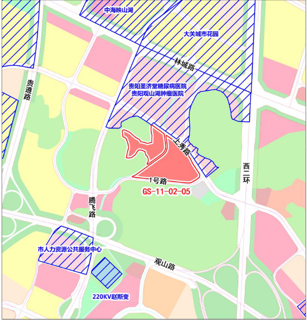 地图显示,站前单元 GS-11-02-05 地块上已有观山湖区肿瘤医院、观山湖区疾病预防控制中心等医疗项目,以及中海映山湖、龙湖天曜、大关城市花园等住宅项目。