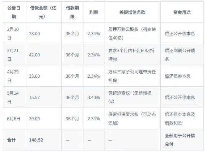 而所有借款的用途也都明确指向同一目标:帮助万科偿还公开市场发行的债券本金与利息。
