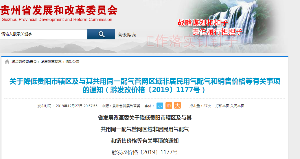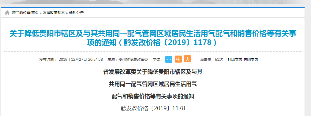 12月27日,贵州省发展和改革委员会发布两则通知,2020年1月1日起,将降低贵阳市辖区及与其共用同一配气管网区域居民生活用气和非居民用气配气和销售价格,省级定价区域居民生活用气配气价格下调为0.82元/立方米,非居民用气配气价格下调为0.72元/立方米。同时,将对城乡低保户、农村五保户家庭每年每户设置的免费气量调增为72立方米/户·年。