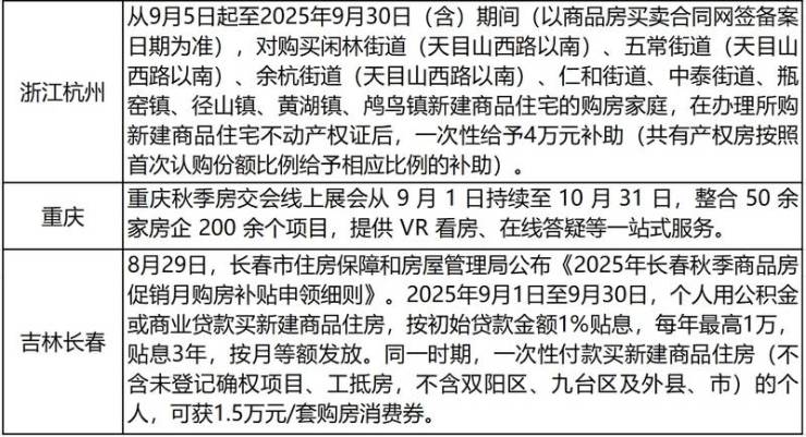 房展会成为线下引流的重要载体。比如,重庆秋季房交会线上展会从9月1日持续至10月31日,整合50余家房企200余个项目;河南则计划在年底前举办不少于100场房展会;吉林省延吉市于9月20日至10月31日举办2025年秋季房交会,除企业自主推出的“购房立减”等福利外,政府对购买新建商品房的群众按照每平方米补贴500元、最高补贴5万元。