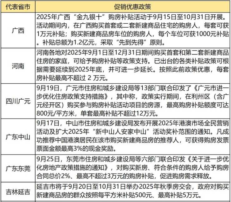 以广西为例,2025年广西“金九银十”购房补贴活动于9月15日至10月31日开展。活动期间内,在广西购买首套或二套新建商品住宅的购房人,每套可获1万元补贴;购买新建商品房车位的购房人,每个车位可获1000元补贴。补贴总额为1.2亿元,采取“先到先得”原则。截至9月18日,已有超400万元补贴额度完成发放。